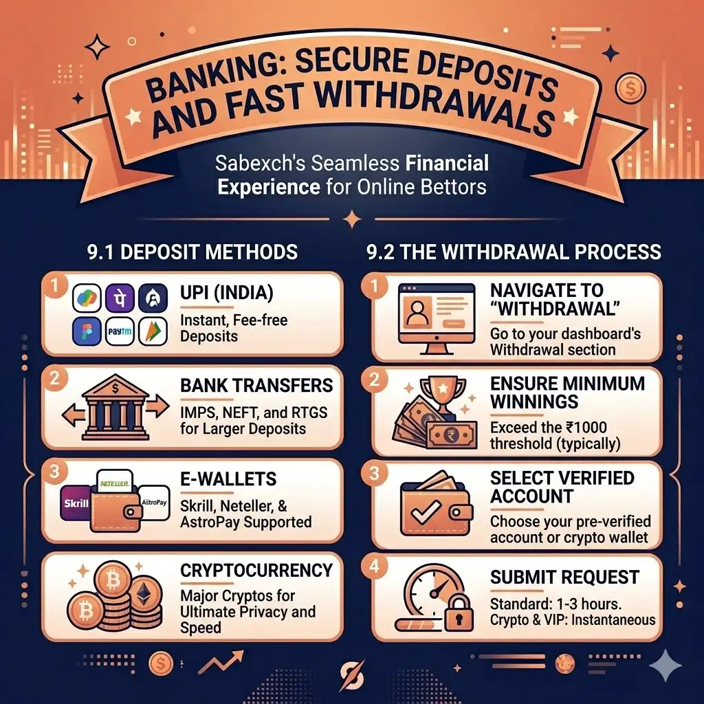 - Cryptocurrency: For ultimate privacy and speed, Sabexch accepts major cryptocurrencies like Bitcoin (BTC), Ethereum (ETH), and Tether (USDT).