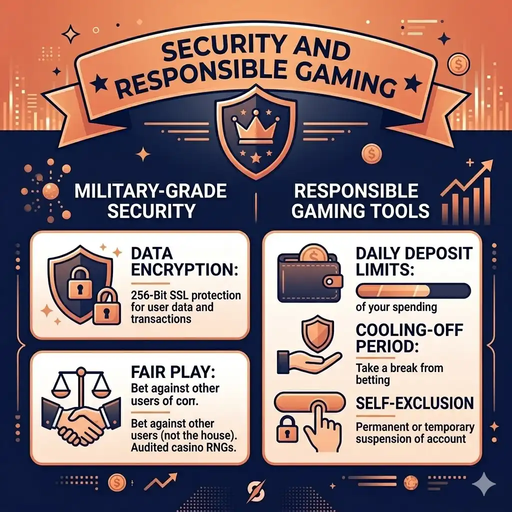 - Fair Play: The exchange model inherently promotes fair play (since you bet against other users, not the house). Additionally, all casino RNGs (Random Number Generators) are regularly audited.